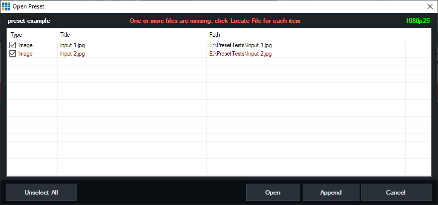 If a preset is opened with one or more files missing, the following will appear: