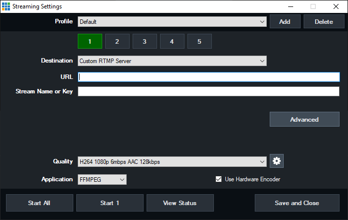 By default, all five destinations will use the same quality settings such as video and audio bitrate and encode size.