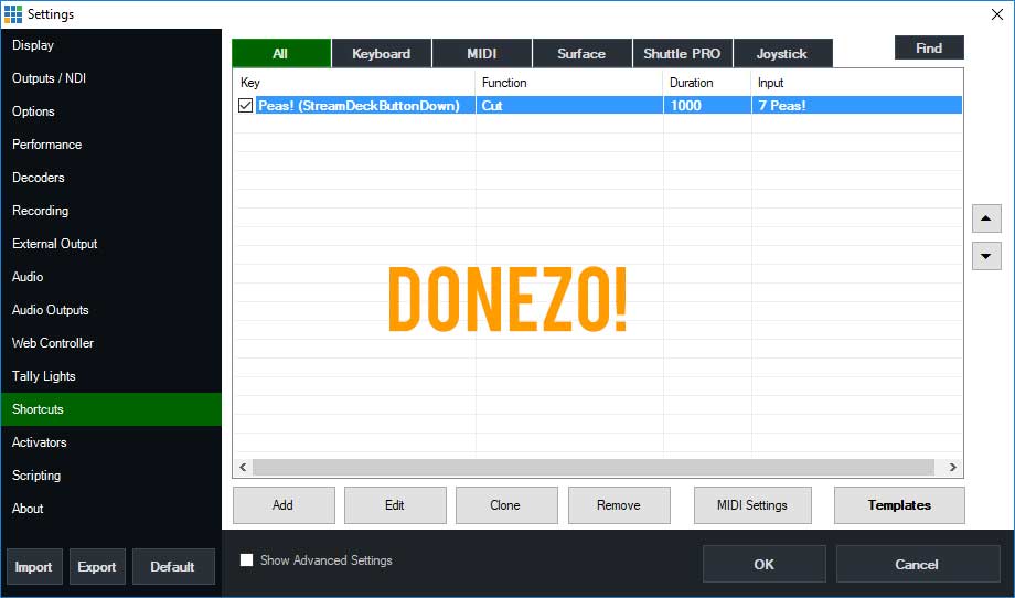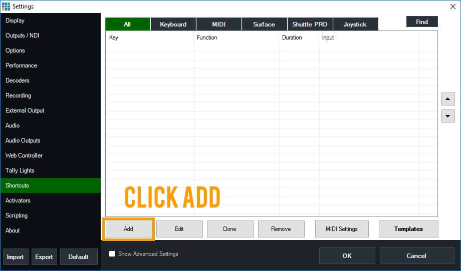 Ok, so let's head to vMix! You'll need to go to Settings -> Shortcuts and then add a shortcut.