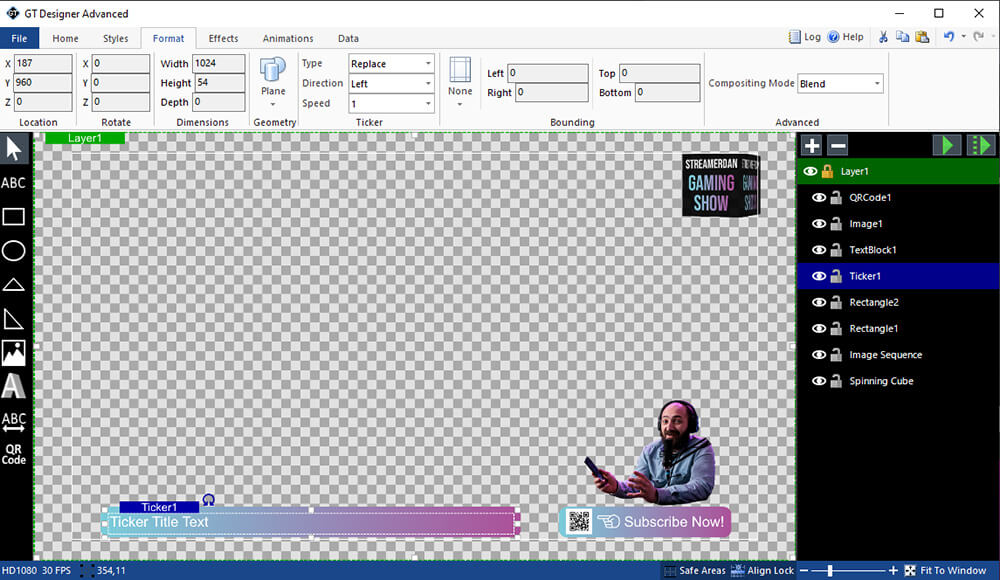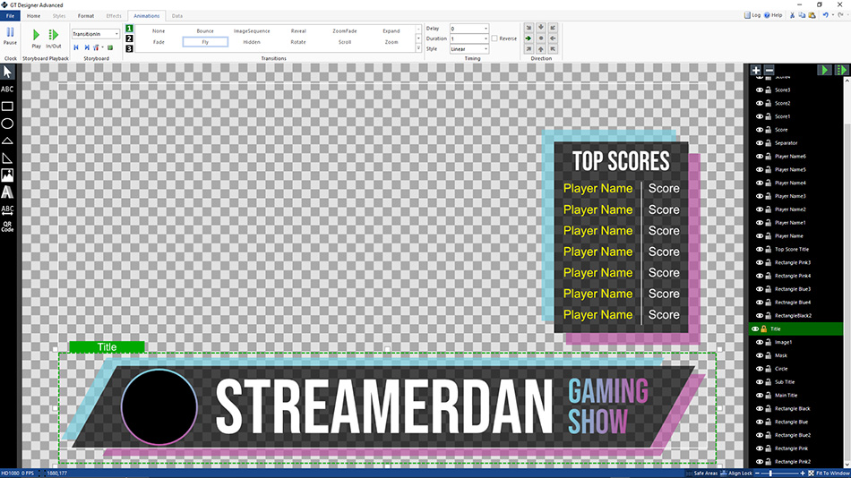 Along with all the inclusions of GT Designer Standard, GT Designer Advanced allows you to add animation/transition effects to all objects and layers. It also supports the ability to import your own PSD files and convert any text elements into data driven objects.