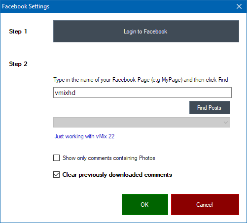 To find a Facebook post directly from vMix Social, type in the name of the page (without the full url) and click Find Posts.