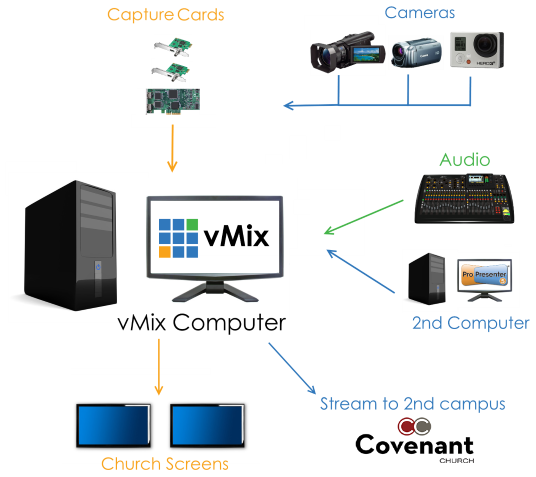 Covenant Church uses vMix in quite a unique way for their services. Not only do they use vMix for their services but they have 2 campuses that are linked each week and the service from the main campus is streamed live to the secondary campus via vMix!